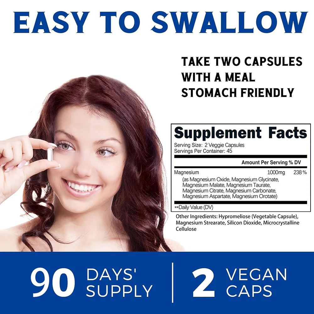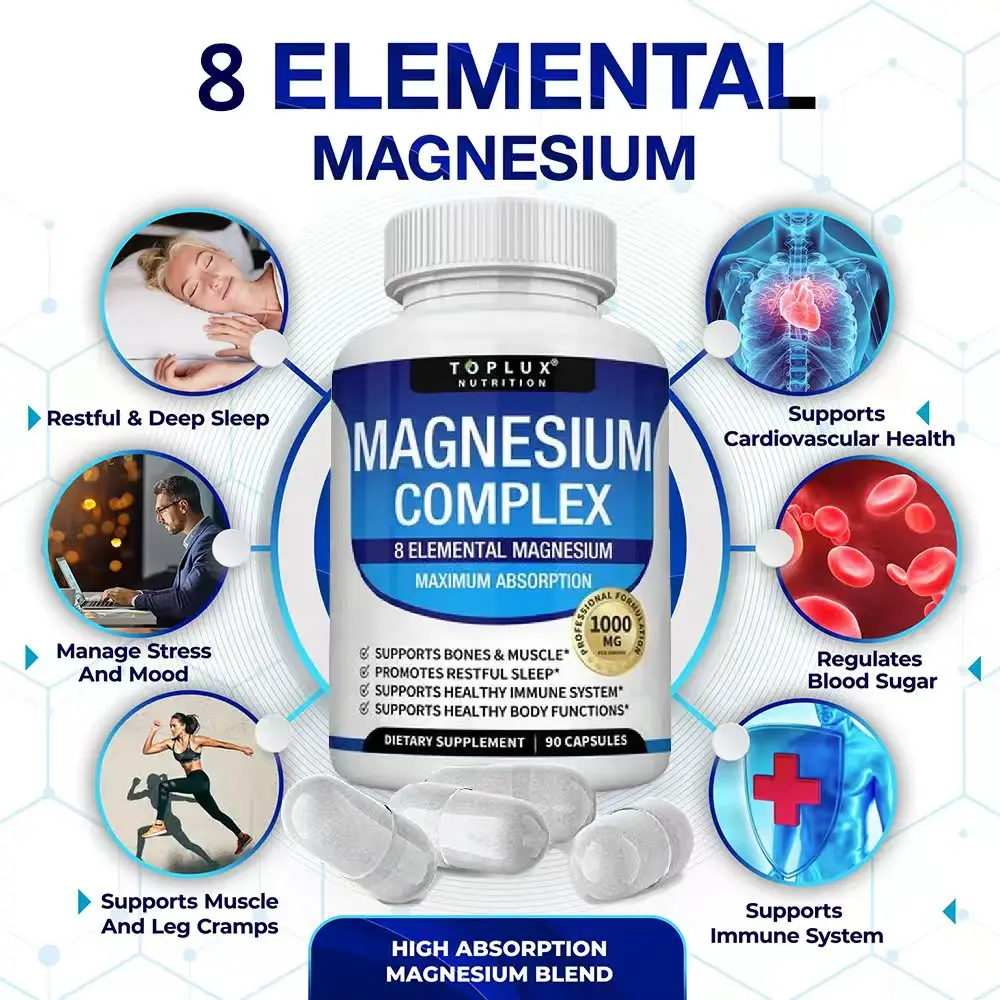 Magnesium Complex Supplement | 1000mg Magnesium Glycinate, Malate, Citrate | 8 Elemental Chelated Formula | Vegan, Non-GMO, 90 C